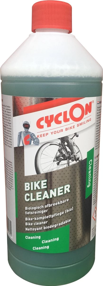 Cyclon® Bike Cleaner voor het reinigen van hardnekkige vervuiling zoals modder, lichte olie aanslag en overige dagelijkse vervuiling. Fosfaat vrij, schoonmaakmiddel, droogt streeploos op, biologisch afbreekbaar, geschikt voor matte, gelakte, ongelakte en kunststof ondergronden. Gebruiksaanwijzing Het vervuilde oppervlak insprayen; De schuimlaag enkele minuten laten inweken; Zware vervuiling met een borstel los borstelen; Afspoelen met een zachte waterstraal of afnemen met een natte spons; Indien nodig met een goed absorberende doek droogwrijven.