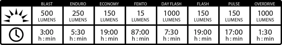 – Maximale brandduur: 87 uur op de FEMTO stand (15 Lumen)