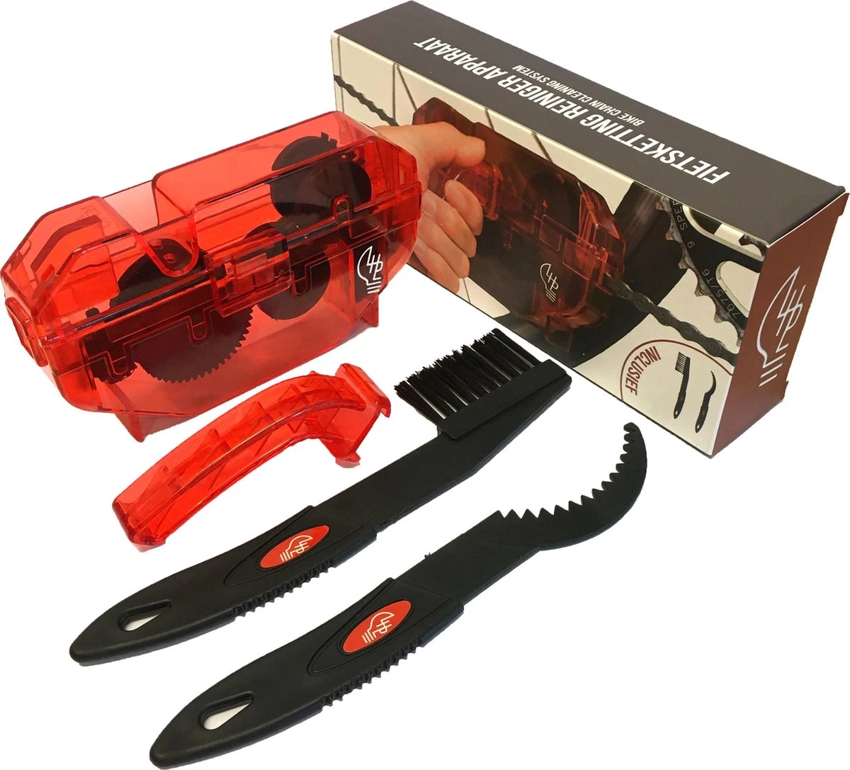 Zoek jij naar een handig gereedschap om jouw fietsketting eenvoudig schoon te maken van zand, modder en ander vuil? Dan is dit het Life Hack Product van de fietsonderhoudsmiddelen wat jij zoekt! Door gebruik te maken van deze schrobmachine met roterende borstels maak je jouw ketting met gemak schoon. Dit zonder beschadigingen of je handen vies te maken. In deze set zijn er naast de kettingreiniger twee extra tools inbegrepen om de tandwielen ook schoon te borstelen! Wat deze set compleet maakt, is dat er een biologisch afbreekbare ontvetter en een ketting smeermiddel is inbegrepen!