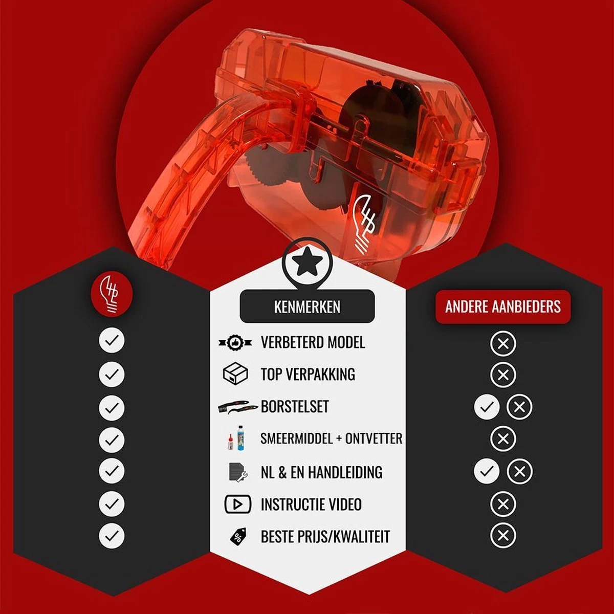 Kortom, de LHP fietsketting reiniger apparaat 5-in-1 set is de meest complete en voordeligste set om je fietsketting schoon te maken.
