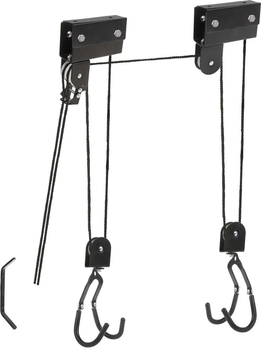Deze fietslift is gemakkelijk en snel aan het plafond bevestigd met het meegeleverde montage materiaal. Door aan het snoer te trekken wordt de fiets omhoog gehesen. Door deze manier kan je jouw fiets gemakkelijk opbergen op een ruimtebesparende manier en met de rubberen haken bescherm je de fiets tegen lak beschadigingen.