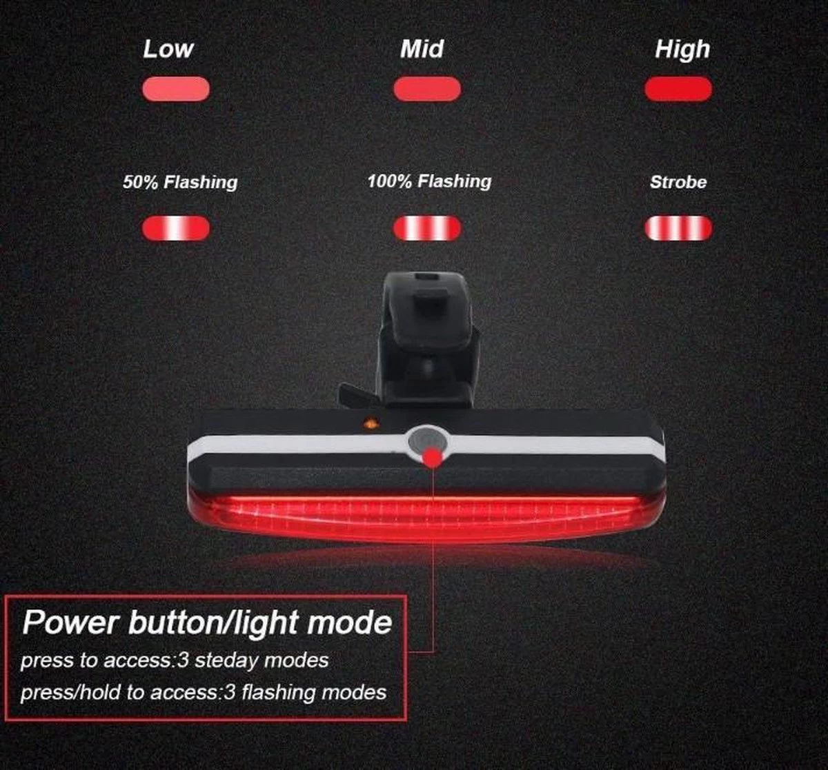 Naast de gangbare steady / flash-modi in ROOD biedt dit waterdichte IP65-fietslicht 6 modi: Standaard, Hoog, Overdrive, 50% knipperend, 100% knipperend en flitser.