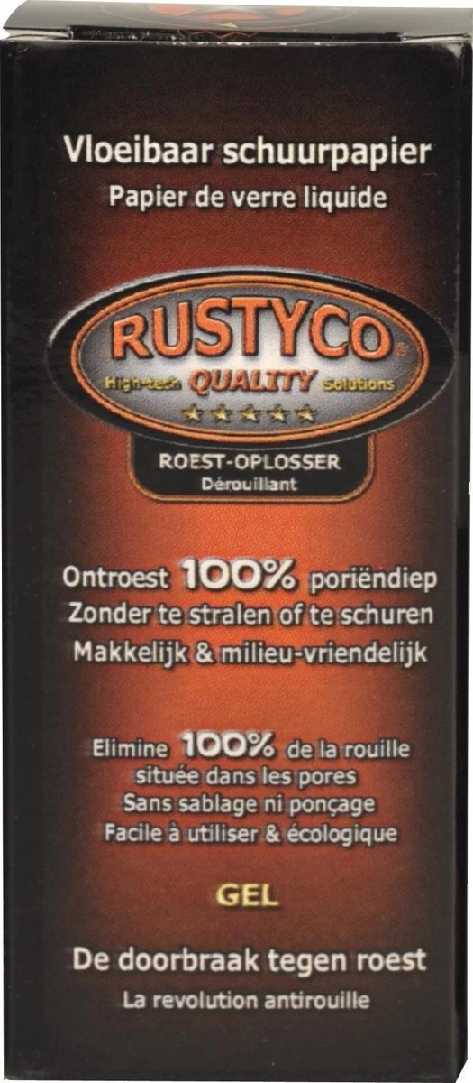 Rustyco Gel Roestoplosser in 50ml verpakking is een dikke vloeibare roestverwijderaar in een klein flesje. De 50ml Rustyco Roestoplosser Gel verwijdert roest, corrosie en oxidatie tot diep in de poriën. Naast het verwijderen van roest, laat de Rustyco Gel direct een anti roest bescherming op metaal achter. Dankzij de unieke formule maakt deze professionele roestoplosser de ondergrond microscopisch schoon en roestvrij. De ideale basis voor een primer, grondverf, lak of verflaag!