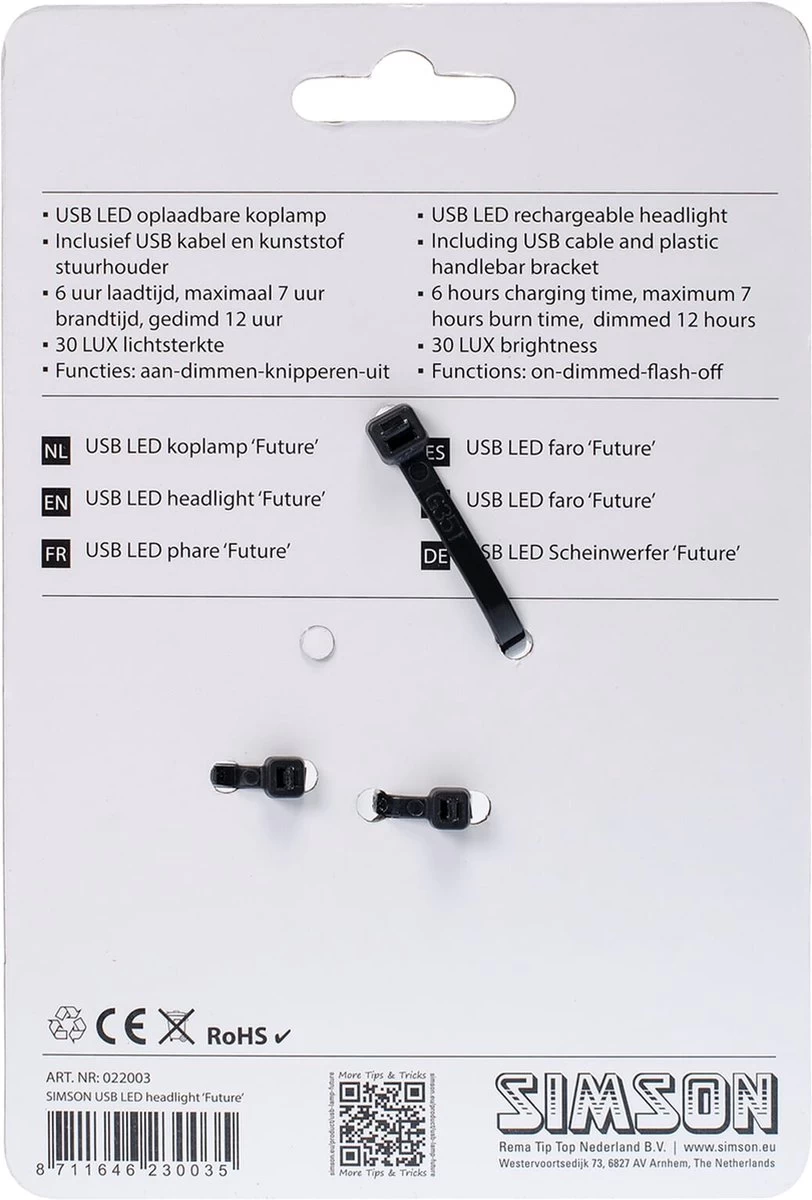 De Simson USB-koplamp Future is een krachtige, oplaadbare koplamp met een kunststof behuizing en stuurhouder. De lamp is eenvoudig op te laden via de USB-poort van de computer. De led biedt een zeer sterke lichtbundel met een opbrengst van wel 30 Lux! Monteer de lamp met de schroefsluiting, zonder het gebruik van gereedschap met de meegeleverde bevestigingsring op het stuur.