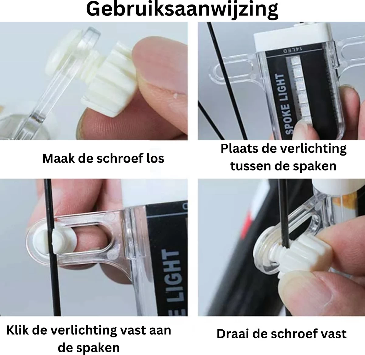 Het product is zeer simpel te installeren. Ont schroef de zwarte schroeven, plaats de verlichting tussen de spaken, bevestig de schroeven en klaar is kees, dit is binnen 1 minuut gedaan.